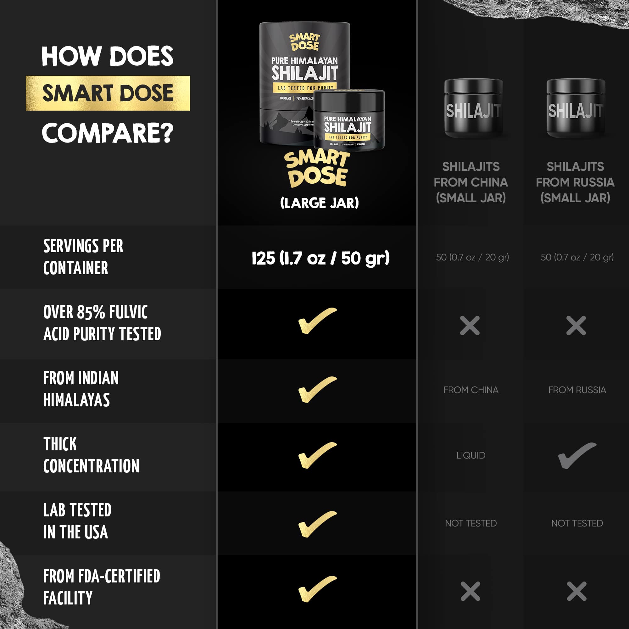 Smart Dose Shilajit is one of the purest shilajits available on the market. It is sourced directly from the Indian Himalayas, free from additives and contaminants, and it is third-party lab tested in the US to consistently contain over 85% fulvic acid. This ensures that our Shilajit meets the highest standards of quality and purity.